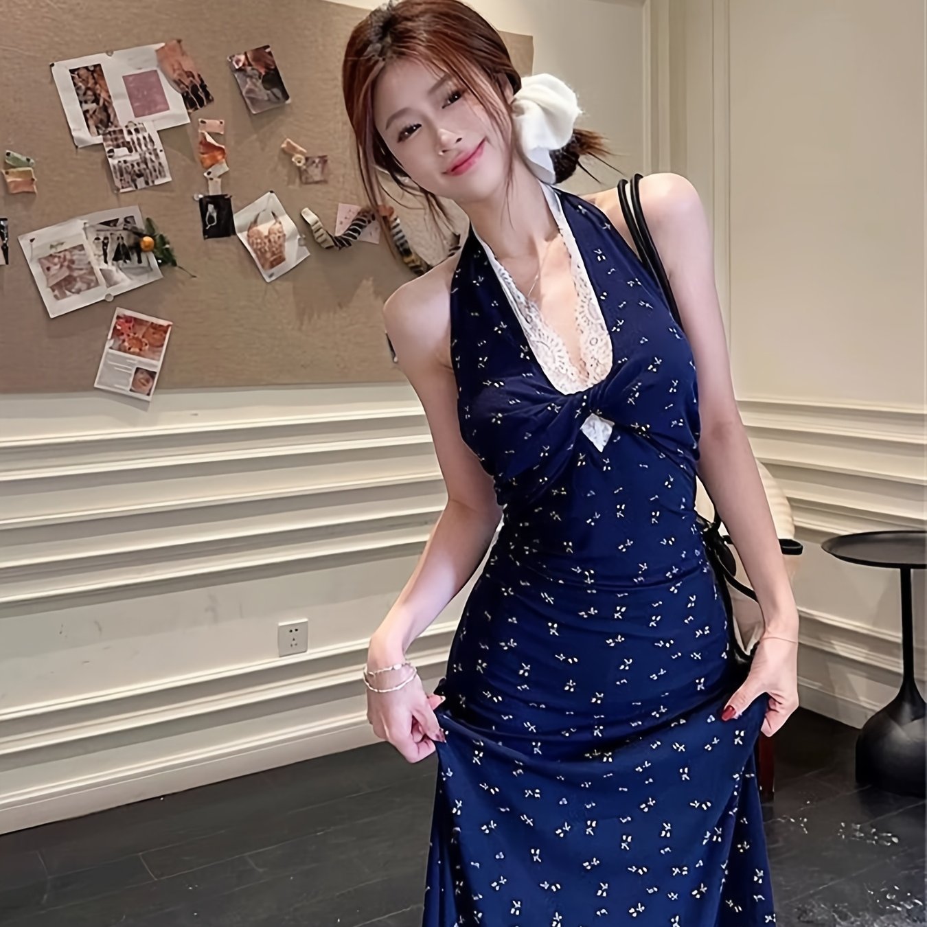 TEMU 여성용 플로럴 홀터넥 멜빵 원피스 여름 신상 슬림 기품 있는 엉덩이 커버 롱 원피스
