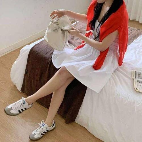 나시 뷔스티에 블라우스 리본 프릴 플레어 휴양 GWM 슬리브리스