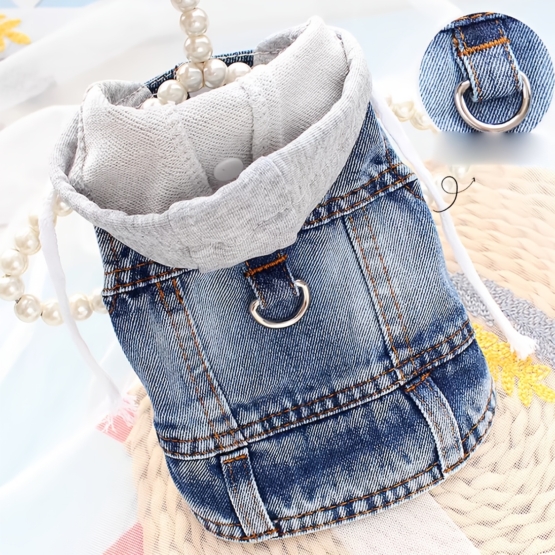 TEMU 1개 신상 트렌디 브랜드 후드 하네스 조끼 모조 데님 스프링/가을 소형견 의상, 비숑, 테디, 애완견 및 고양이에게 적합