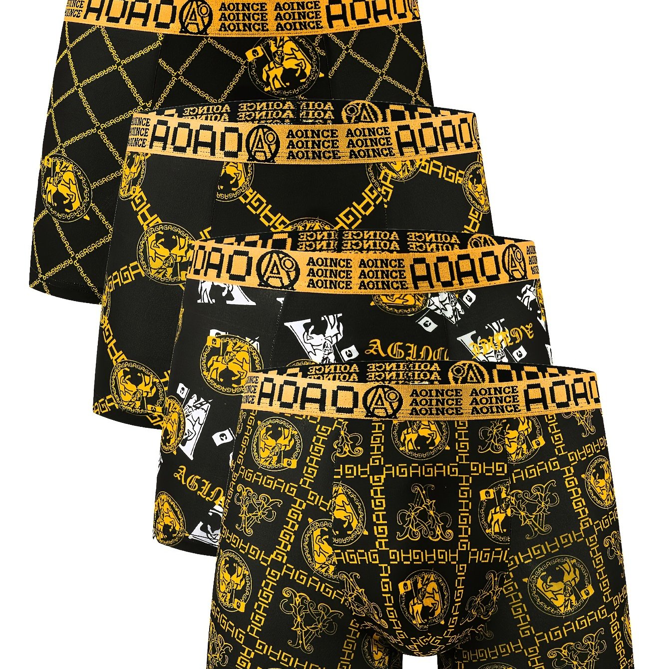 TEMU 패션 블랙 골드 체인 프린트 남성용 속옷 4pcs 세트, 부드럽고 편안한 통기성 남성 플랫 속옷, 빠른 건조 스포츠 속옷