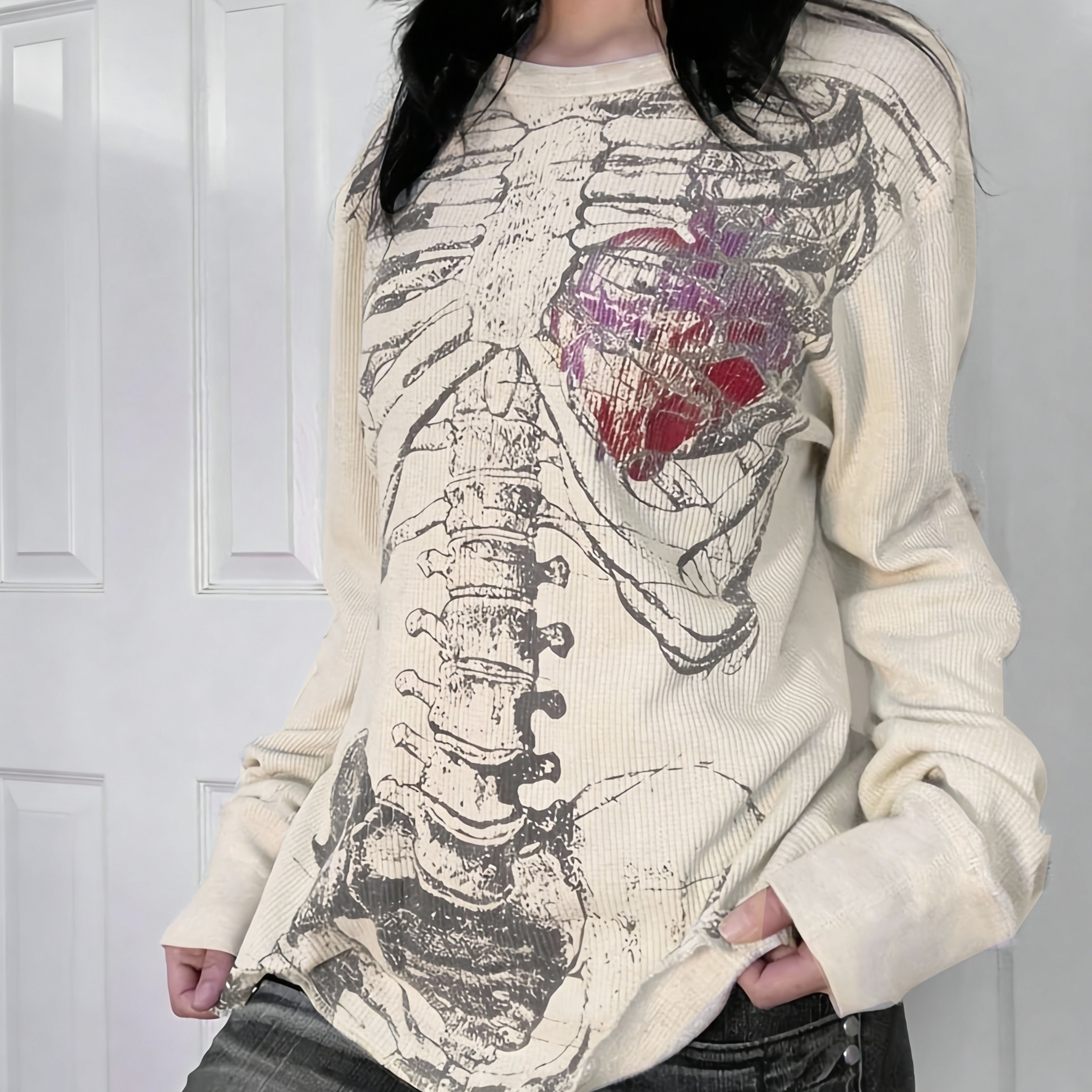 TEMU 여성용 Y2K 빈티지 고딕 스컬 & 간쿠츠-조류(웨이스트번) 프린트 긴팔 티셔츠 - 일본 쓰레기 펑크 스타일 라운드넥 티, 미디엄 스트레치 세탁기 사용 가능 레이어링 탑