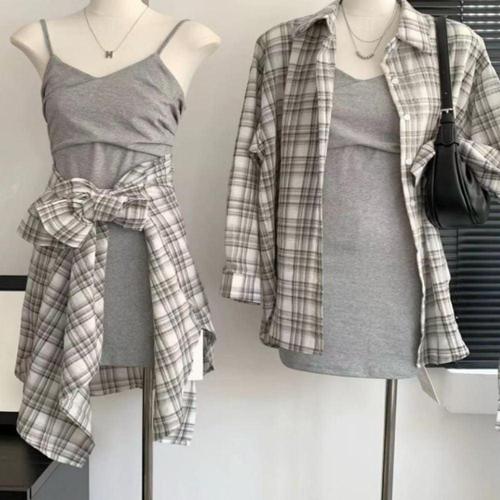 [에이치플러스몰]캐주얼 롱후드셔츠 여름 루즈핏 여성 긴 체크 셔츠