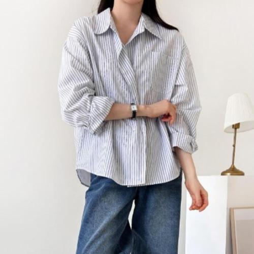 [옷자락]여성용 봄여름 경량 면 스트라이프 롱슬리브 셔츠