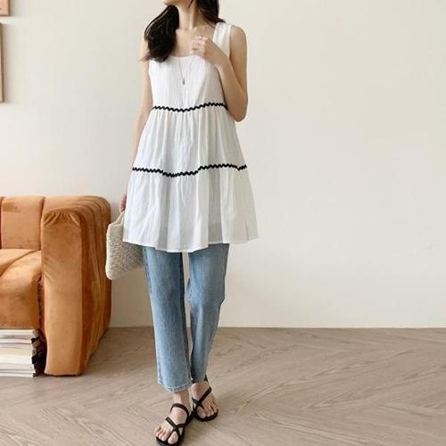 [신상오픈런]|CDH2648|가소기 엠브로이더리 배색 블라우스 긴 여성 웨이브 썸머 민소매_18159314_597559