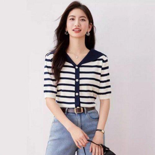[모노무드]MNO 아우터니트 하프슬리브 여름니트 우먼세일러 모던 세로줄