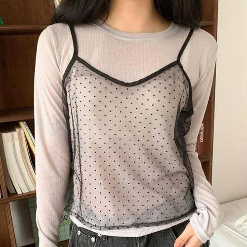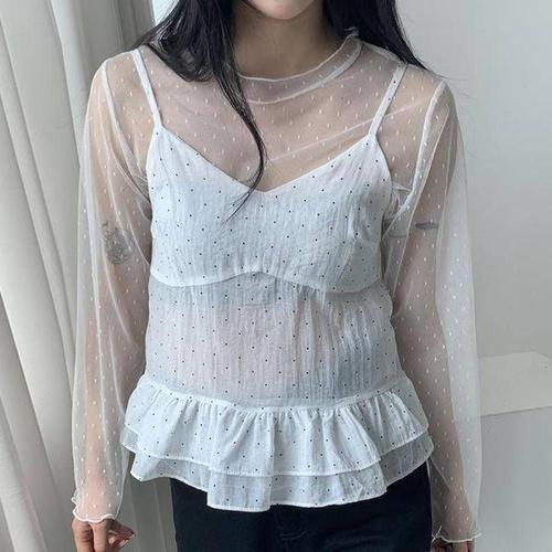 [에이치플러스몰]셔츠 브이넥 도트 끈 뷔스티에 여름 롱니트 하