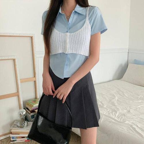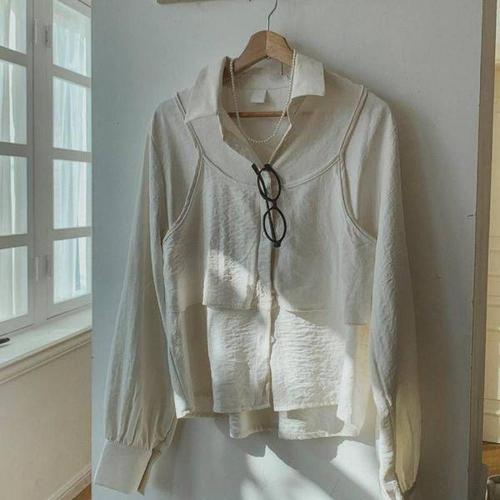 [에이치플러스몰]쉬폰 셔츠 뷔스티에 나시 롱니트 셔링 온나핏