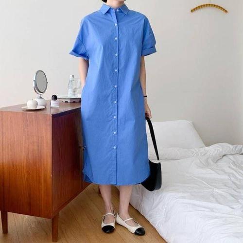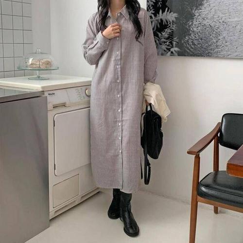 [에이치플러스몰]셔츠 원피스 양브이넥 하객 데님 롱니트 롱 휴