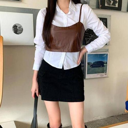 [에이치플러스몰]여름 여성 베바르 캉캉 셔츠 레더 롱니트 셔링