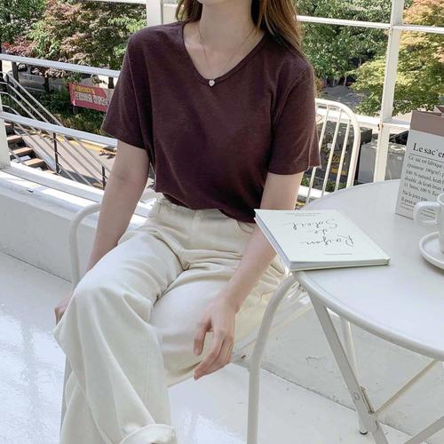[옷자락]여성 데일리 무지컬러 린넨 브이넥 반팔 티셔츠
