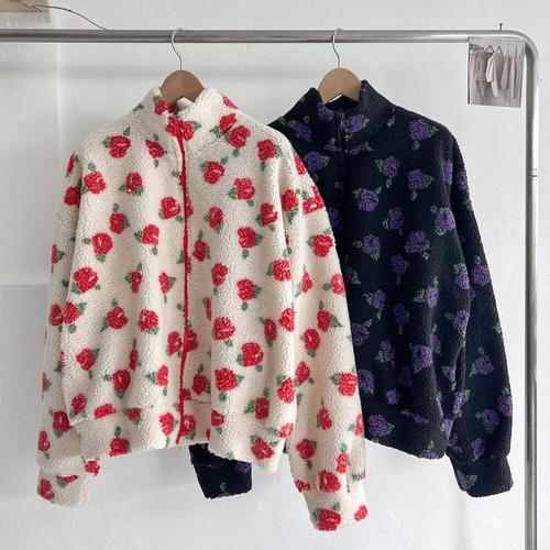 [옷자락]여성 빅사이즈 퍼플라워 배색 하이넥 양털 재킷