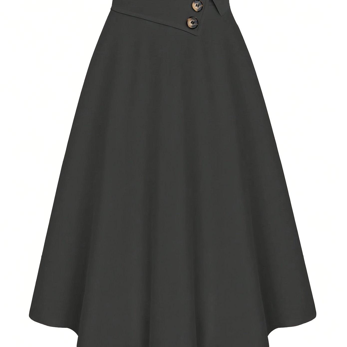 TEMU 여성 A라인 하이웨이스트 플리츠 스커트 - 솔리드 블랙 버튼 디테일, 구조적인 허리 밴드, 플레어 밑단으로 데일리 및 포멀룩에 적합 - 봄/가을 트랜지션 스커트