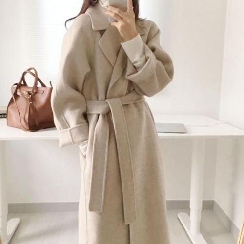 롱코트 여성 겨울 더블카라 클래식 허리끈 롱 모직 코트