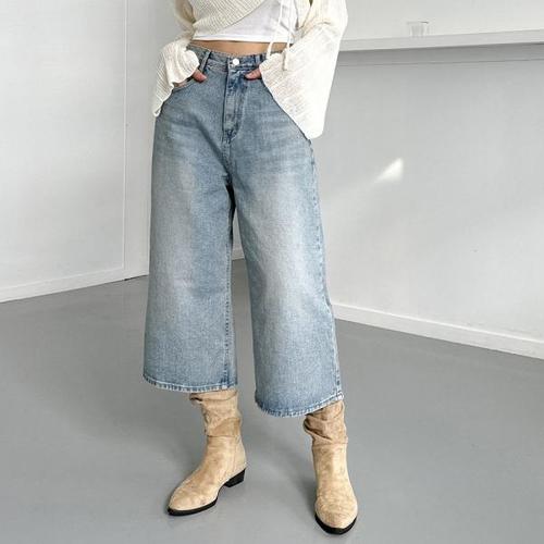 여성 힙무드 워싱 와이드핏 7부 하이웨스트 청바지