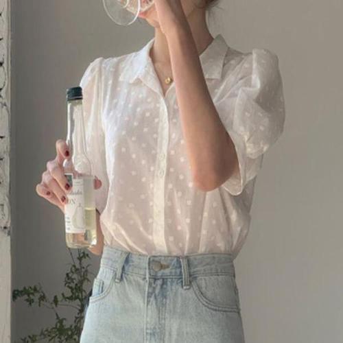 [셀러허브_여성트랜드패션]반팔블라우스 시스루 블라우스 퍼프소매 프릴블라우스