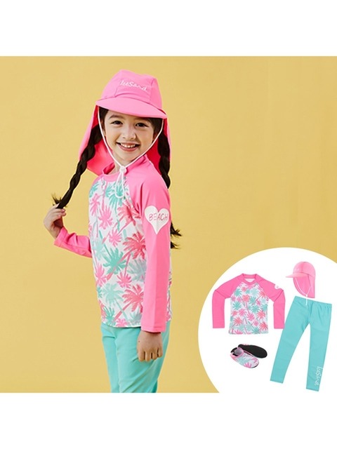 [아이스샌드] 아이스샌드 키즈 아동 여아 래쉬가드+플랩캡+ 아쿠아슈즈 4피스 수영복 세트 BR-30107K