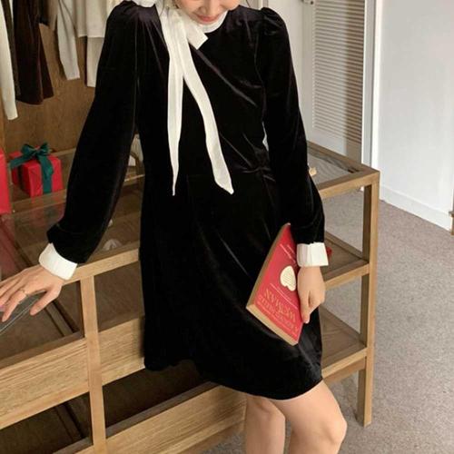 시크 벨벳 배색 리본 원피스 파티룩 연말 미니드레스 WFIY8K7