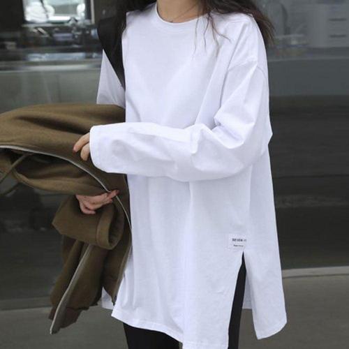 [옷자락]여자 베이직 라운드넥 옆트임 루즈핏 힙덮는 긴팔티셔츠