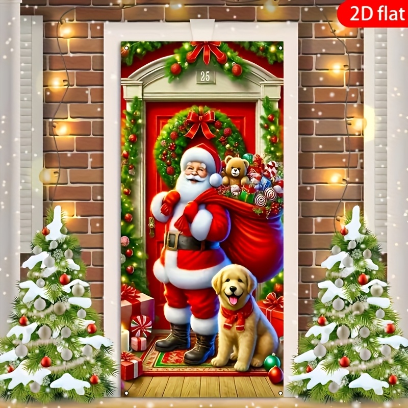 TEMU 2D 플랫, 2D 도어 배너, 2D 플랫 플래그, 크리스마스 산타클로스와 강아지 테마 패턴 도어 배너, 인스타 스타일 범용 핏, 겨울 크리스마스 테마 배경 천, 크리스마스 배경 천, 축제 배경, 계절 장식, 축제 디자인, 장식 배너, 2D 플랫