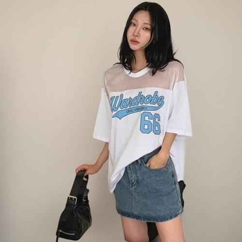 [옷자락]여성 스포티 메쉬 망사 레터링 박스핏 반팔 티셔츠