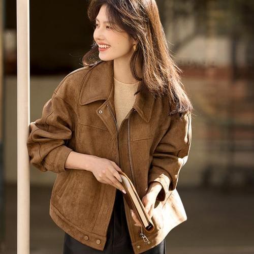 ANYOU 여성 캐주얼 스웨이드 재킷 봄가을 칼라넥 자켓 브라운 오버핏 빈티지 방한 여성 재킷 코트