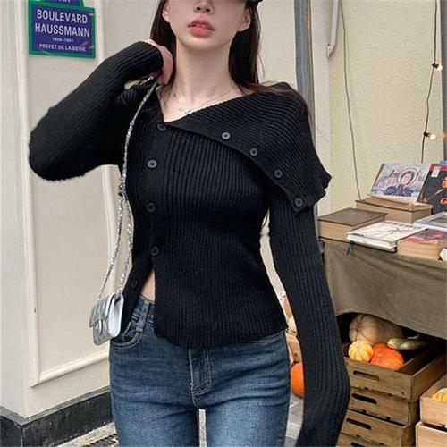 쪼예 네츄럴 언발 오프숄더 슬릿 버튼 긴팔 니트 티셔츠