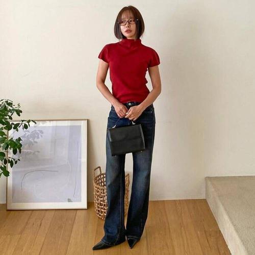 플레어 여성반팔니트 줄리코 뒷버튼 오프숄더니트