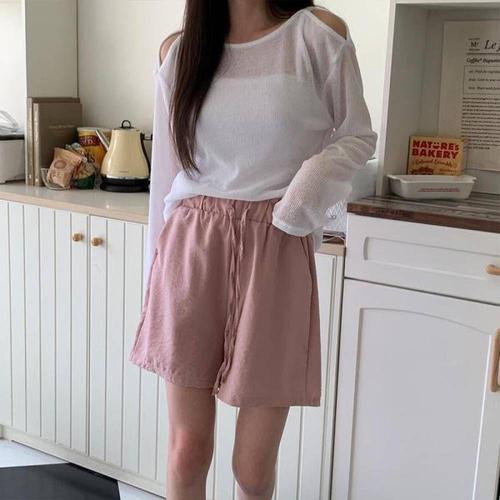 여름 니트 오프숄더 반팔 DHH-E91 리본끈 의류 여성 데일리 언발