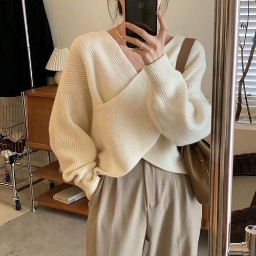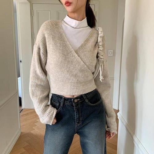 [에이치플러스몰]감성니트 랩스타일 오프숄더 브이넥 니트 긴팔 여성 데일리룩 니트티셔츠