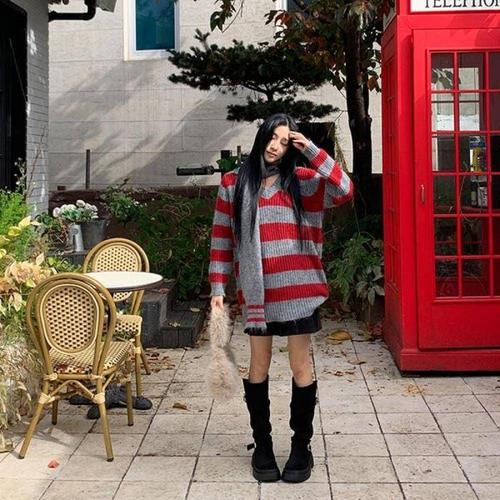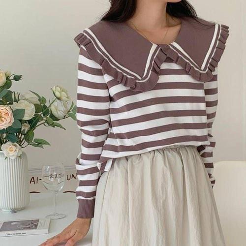 SAHINER 봄가을 여성 스트라이프 오프숄더 루즈핏 니트 스웨터 LBZZS15