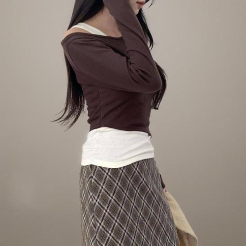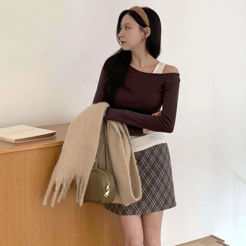[미라클세븐]여성 언발란스 오프숄더 배색 슬림핏 레이어드 티셔츠