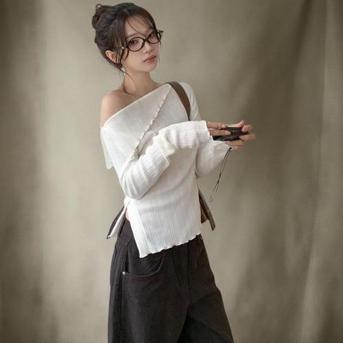 [미라클세븐]여성 오프숄더 프릴 니트 골지 티셔츠 옆트임 디자인