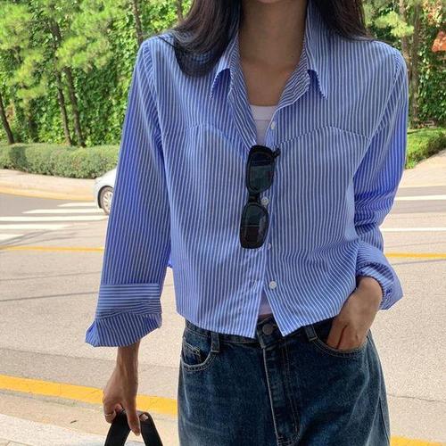 [신상오픈런]여자 카라넥 스트라이프 크롭 긴팔 셔츠 남방