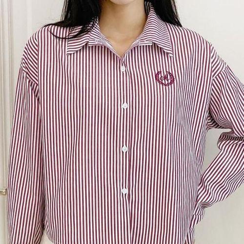 [신상오픈런]여자 카라넥 스트라이프 자수 가을 긴팔 셔츠