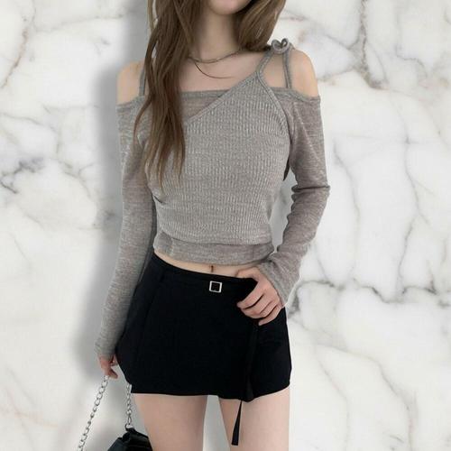 [미라클세븐]여성 슬림핏 언발란스 오프숄더 레이어드 니트