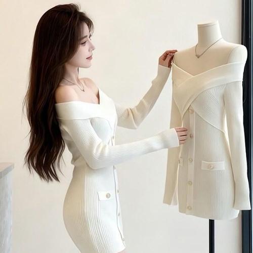 [디자이너몰]여성 오프숄더 크로스 니트 미니 원피스