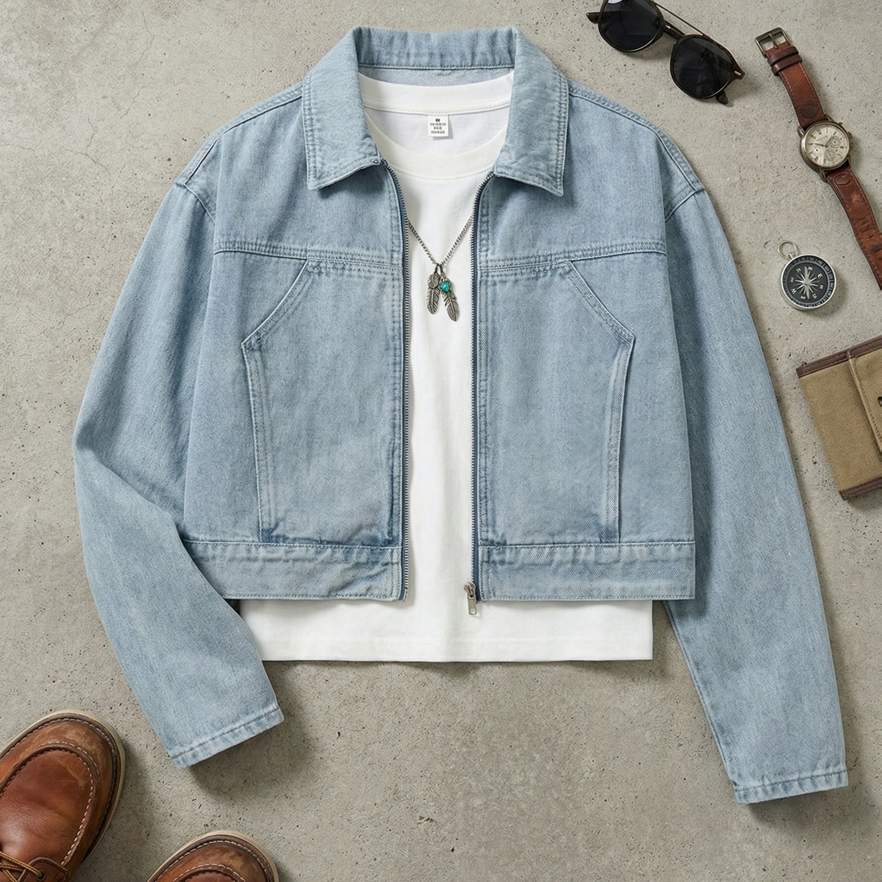 TEMU 남성용 가을용 반팔 페이크 데님 재킷, 루즈핏과 다재다능하며, 빈티지 워싱 룩의 하이 스트리트 스타일을 특징으로 합니다.