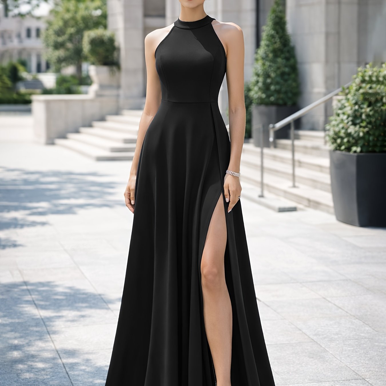 TEMU 스플릿 허벅지 하이 웨이스트 맥시 드레스, 우아한 슬리브리스 크루넥 드레스 파티 & 연회용, 여성 의류