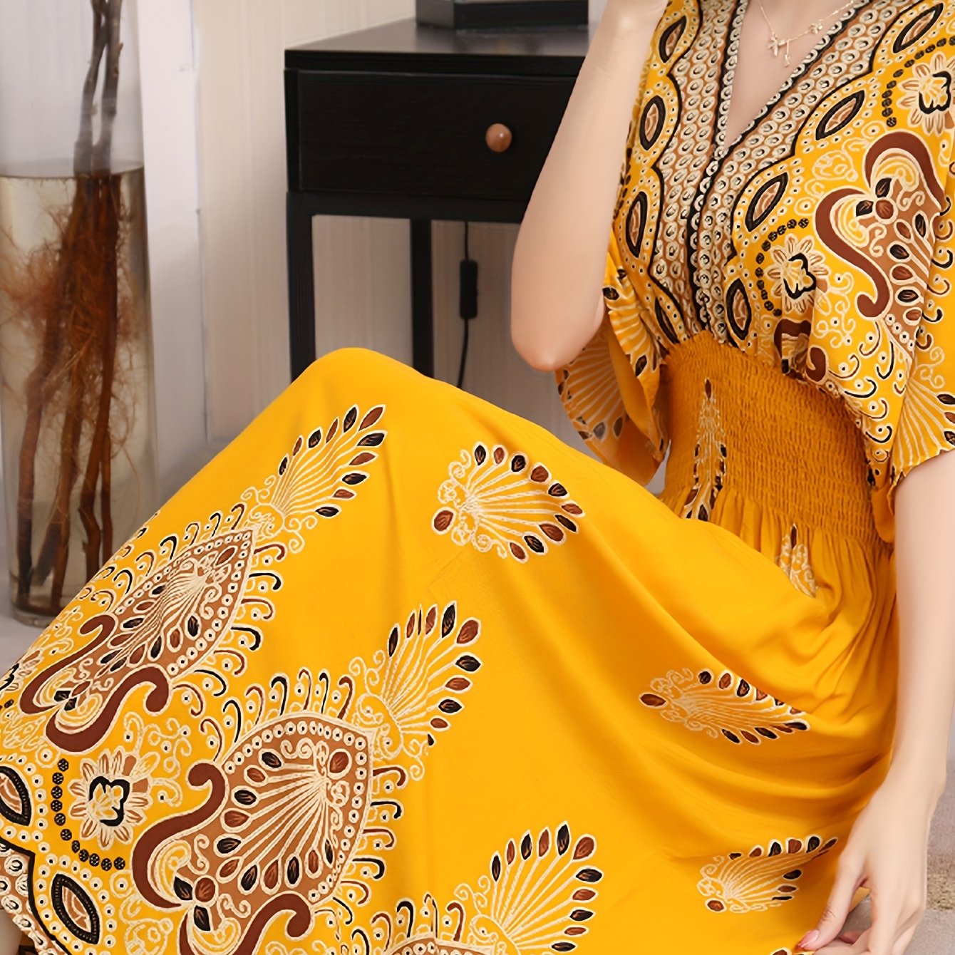 TEMU 여름 에스닉 스타일 여성용 V넥 허리 묶는 반팔 롱 드레스, 해변에서 캐주얼한 휴가를 위한 완벽한 선택 - 루즈핏, 편안함, 피부 친화적, 3가지 색상으로 제공