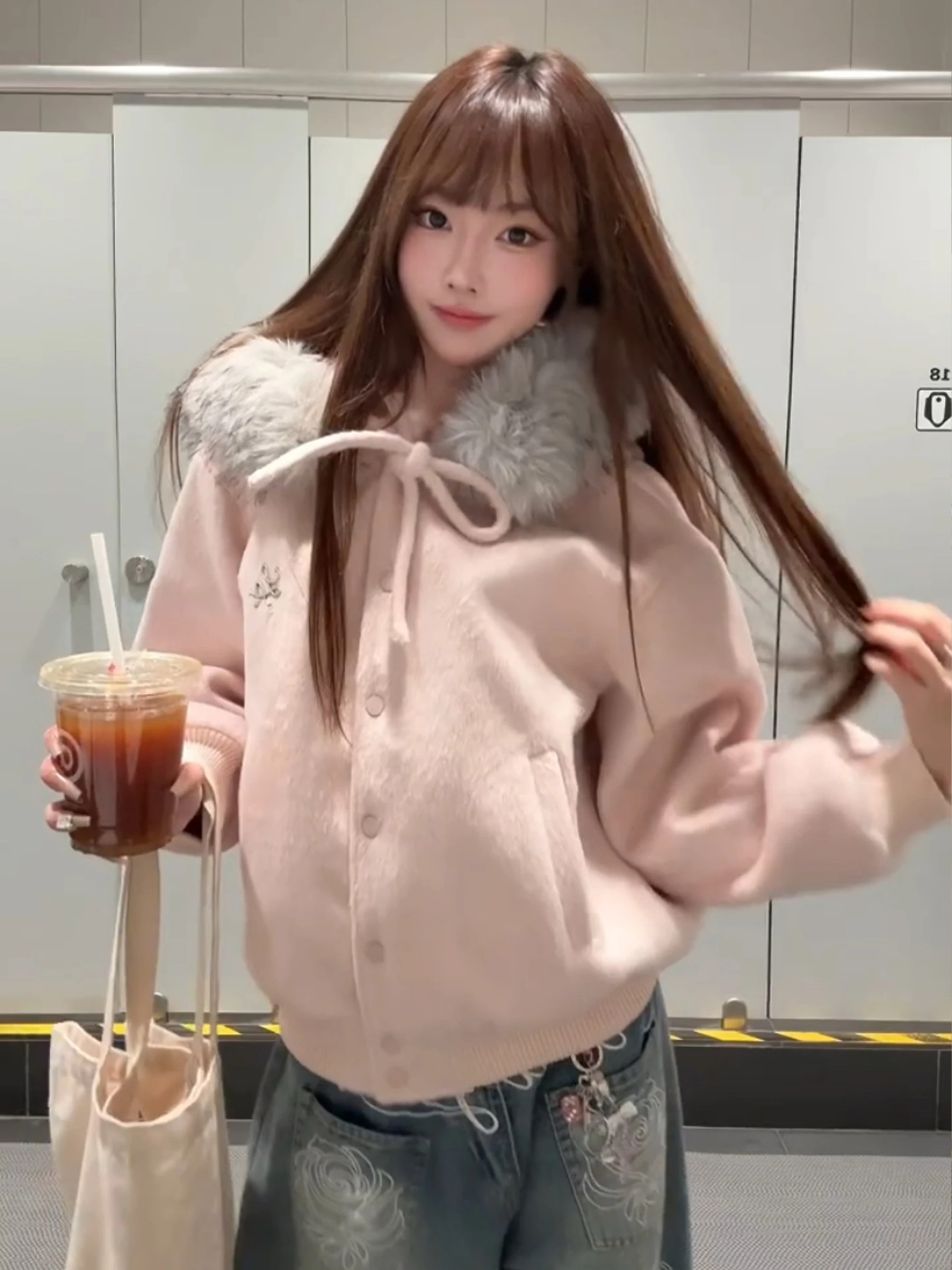 2025 겨울 두꺼운 핑크 오픈 가디건 버튼 달린 울 코트 여성용 루즈핏 나비 매듭 벨트 재킷 상의 따뜻한 플란넬 원단