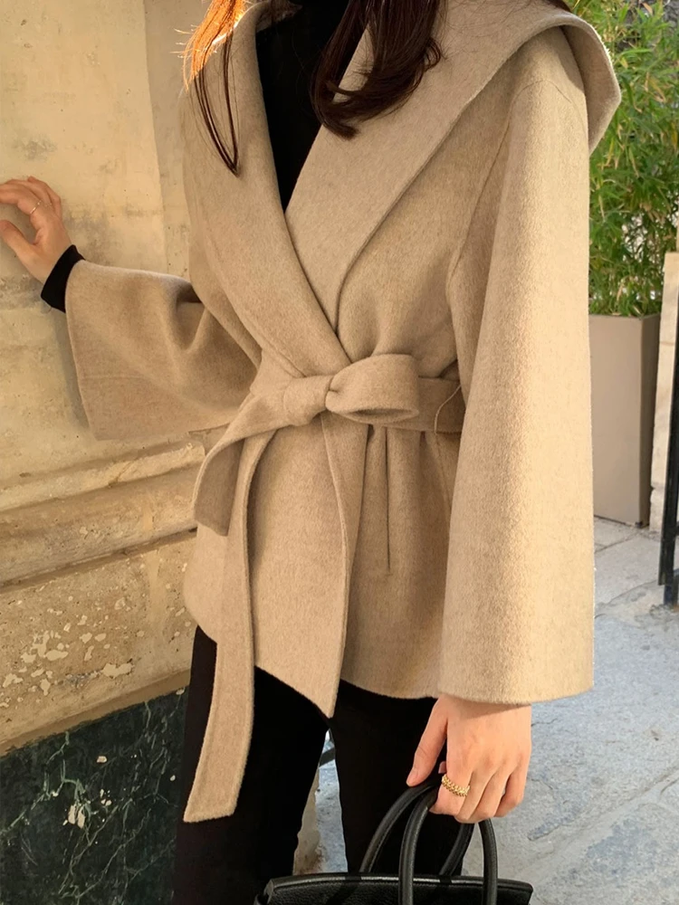 우아한 레이스업 울 숏 코트 솔리드 루즈 라펠 퍼리 벨트 긴 소매 재킷 여성용 2025 가을 겨울 레이디 시크 가디건