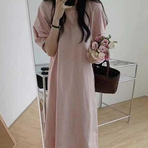 [다잇템_패션]여성 마원단 벌룬소매 귀여운 롱 반소매 원피스