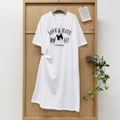 미즈큐즈 / 세친구 고양이 나염 프린팅 루즈핏 반팔 롱 면원피스