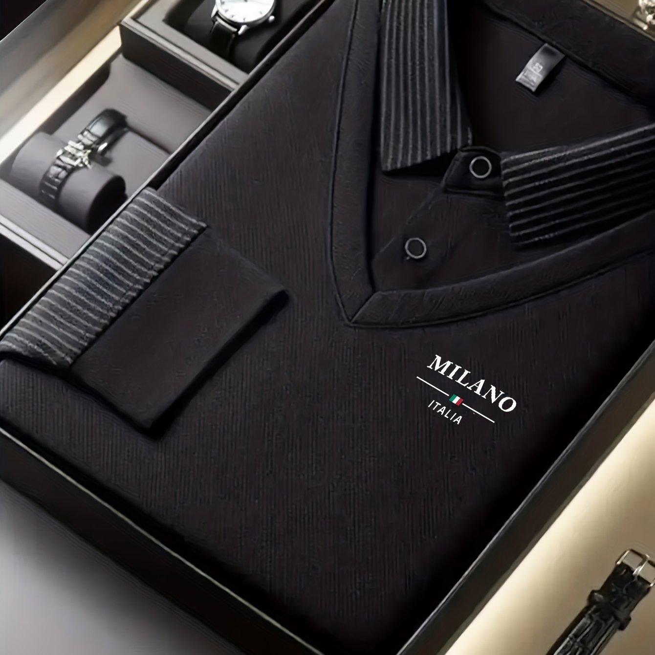 TEMU 상자 미포함 남성용 블랙 스웨터 - 긴소매 페이크 레이어 디자인, 레터 밀란 로고 패치워크 칼라, 하이넥 골프, 비즈니스 캐주얼 및 데일리 웨어에 적합 - 세탁기 사용 가능한 가을 스웨터 - 이상적인 선물, 아웃도어 골프 의류, 니트