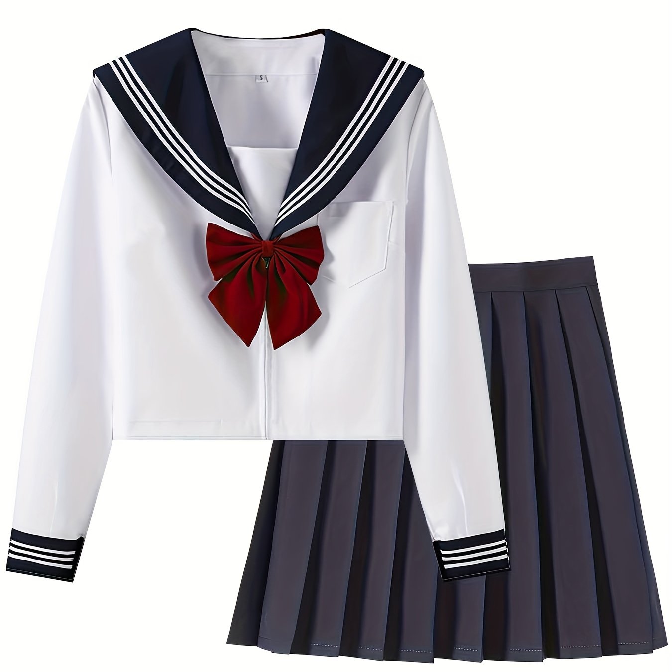 TEMU 캠퍼스 JK 수트 네이비 칼라 화이트 긴팔 여성용 간사이 칼라 학원 스타일 (탑, 스커트, 보우 타이 포함) , 여름옷, 여행, 사진 촬영, 축제에 적합|코스프레
