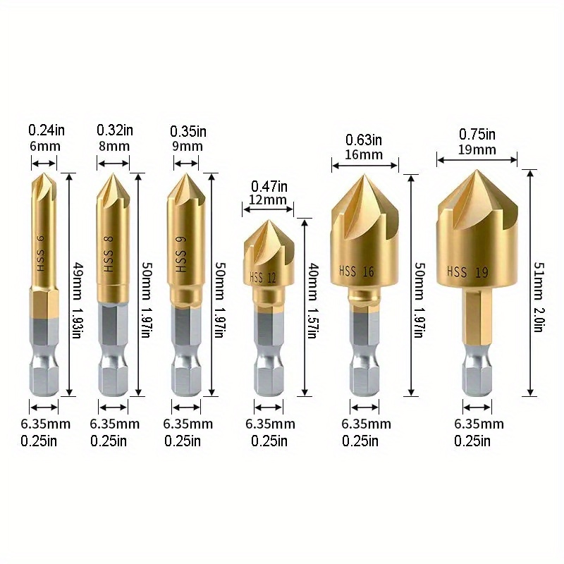 TEMU 6피스 세트 육각 핸들 티타늄 코팅 다섯면 챔퍼링 도구; 구멍이 있는 목공용 챔퍼링 툴; 버리 제거 연장 밀링 커터; 모바일 드릴 비트; 카운터싱크 드릴 비트