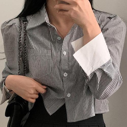 [유아몽드]크롭 반팔 여성 남방셔츠 스트라이프 루즈핏 세미크롭