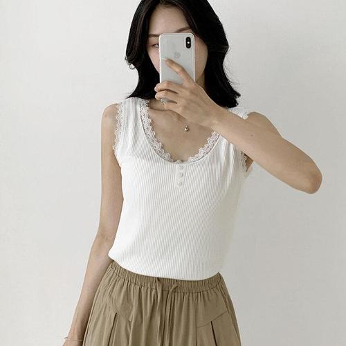 [옷자락] 여자 여름 레이스 버튼 라운드넥 날라리 이너 나시