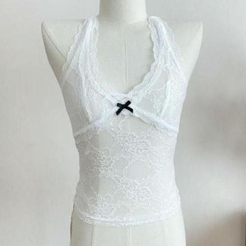 [에이치플러스몰]이너탑 여성 크롭 시스루 레이스 홀터넥 시스루티셔츠