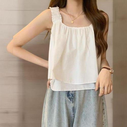 [옷자락]여자 무지컬러 스트랩 이중 민소매 블라우스